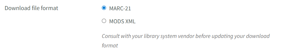 The MARC 21 file format is the default. Many library systems require the standard MARC 21 format. This file contains MARC 21 records in a single long string. If you are unsure about the download file format to use for your system, please consult with your library management system vendor.
