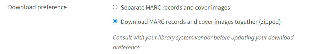 The default format is to include downloaded MARC records and cover images together in one zip file. If you are unsure about the download file preference that best suits your system, please consult with your library management system vendor.