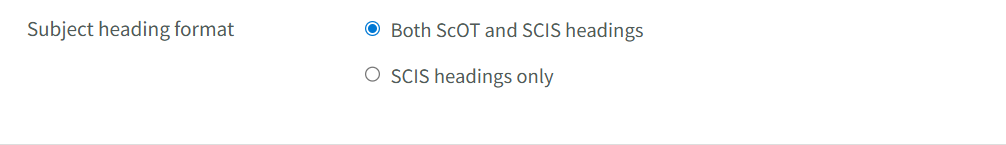 If a record has been assigned both SCIS Subject Headings and ScOT terms, you will receive both sets of headings. Generally, records added to the database since the end of July 2006 have both sets of headings. Otherwise, you will receive SCIS Subject Headings only.